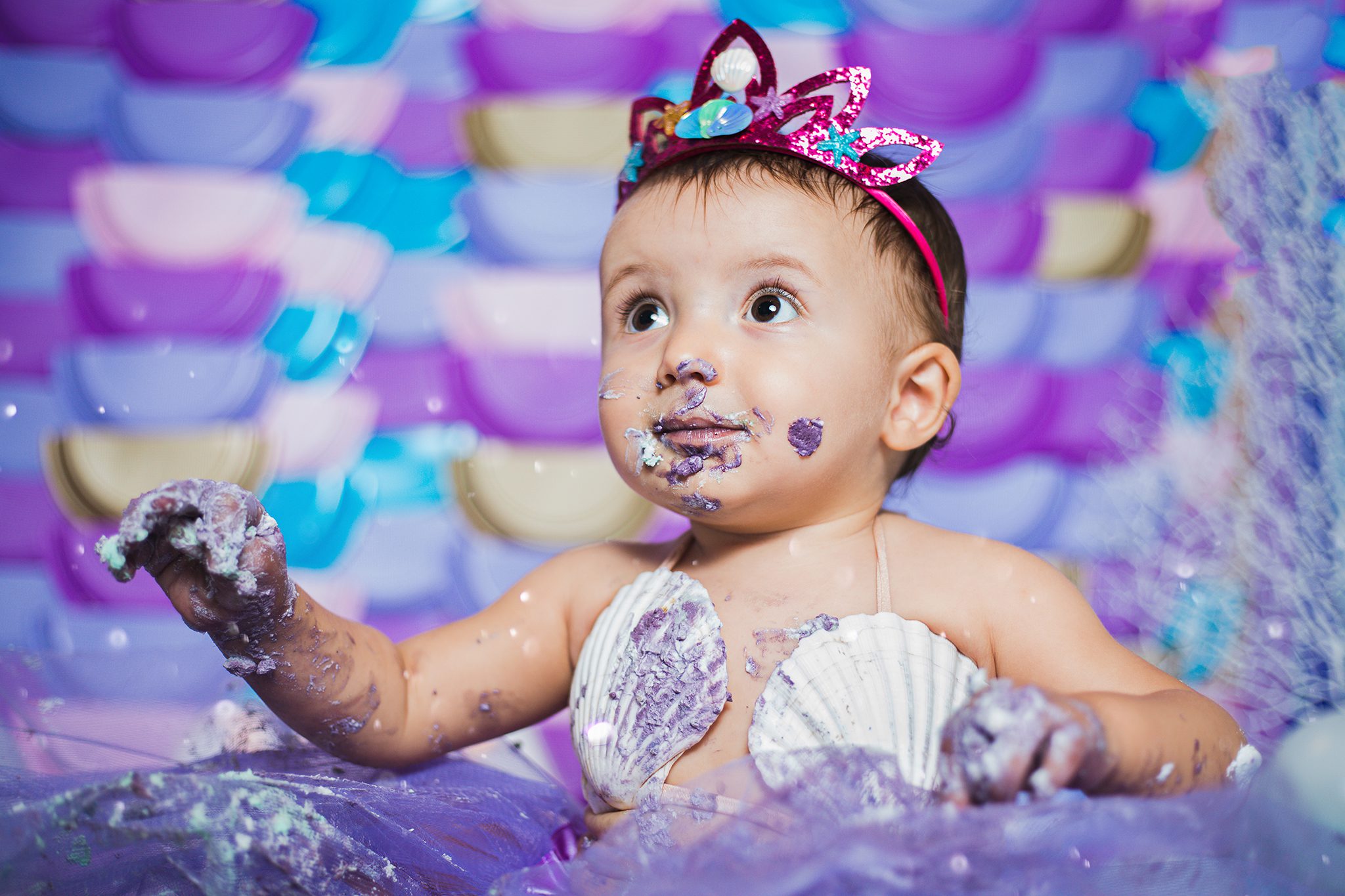 Asia è stata splendidamente attiva: ha distrutto la torta come solo una degna cake-smasher sa fare! Manine e piedini sporchi, con un reggiseno fatto di conchiglie in perfetto stile Sirenetta, la coroncina e tutto il resto, l’intero shooting è stato un susseguirsi di emozioni e divertimento.